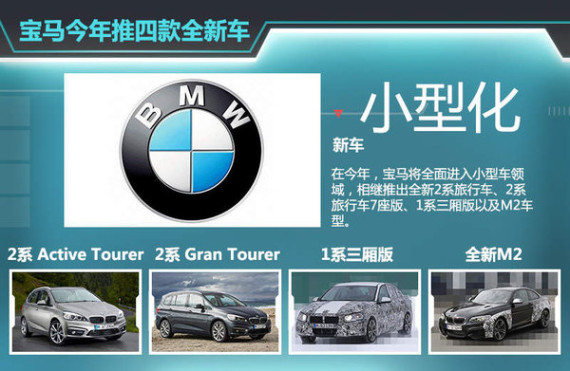 在宝马目前的产品线中,所推出的车型更多是中大型车,而在未来,宝马将增长点瞄准紧凑级车市场。宝马在今年初始在国内推出了基于UKL前驱平台打造的2系旅行车,而在日内瓦车展上,宝马首款7座MPV车型2系 Gran Tourer也正式亮相,之后在今年9月的法兰克福车展上,宝马有望推出基于1系打造的三厢版车型,上述两款车型均有望在今年引入国内市场。此外,值得一提的是,宝马今年还将推出M品牌的入门级车型—M2,该车也势必将吸引更多喜爱宝马性能车的消费者的关注。