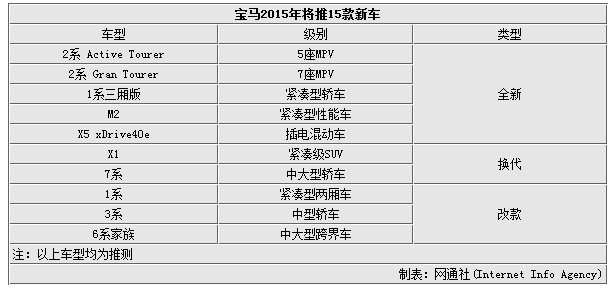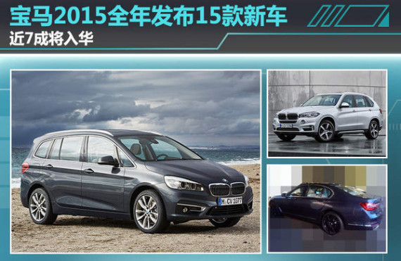位列中国之后的是美国和德国,宝马集团还公布了2015年的产品计划:在2015年先后将有15款新车型或改款车型陆续推出。宝马集团董事长雷瑟夫博士表示:“今年的目标是在全球持续销量增长,再创新高。”在宝马集团2015年发布的15款车型中,7成会在2015年同步进入中国市场,也就是10款车型左右。