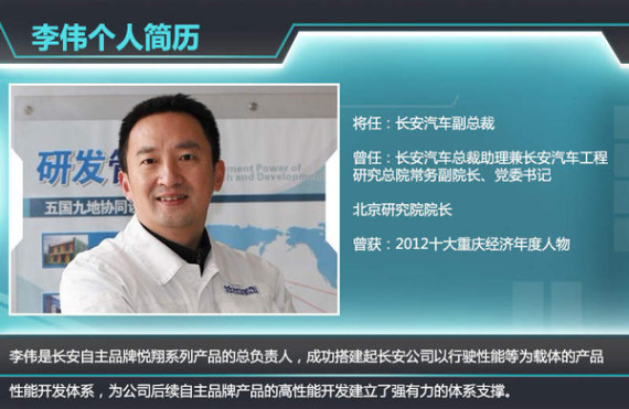 李伟先生历任北京研究院院长,长安汽车总裁助理兼长安汽车工程研究总院常务副院长、党委书记职务。李伟是长安自主品牌悦翔系列产品的总负责人,他成功搭建起长安公司以NVH、行驶性能、综合主观评价等为载体的产品性能开发体系,为长安公司后续自主品牌产品的高性能开发建立了强有力的体系支撑。在李伟和长安汽车股份公司汽车工程研究总院团队的共同努力下,2012年长安汽车陆续上市7款新车,是自主创新产品最多的一年,李伟于当年当选2012十大重庆经济年度人物。