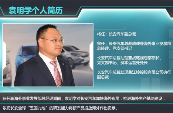 袁明学先生曾任长安汽车总裁助理兼江铃控股有限公司执行副总裁,负责落实公司的各项经营战略及运营管理等工作;之后担任长安汽车总裁助理兼战略规划部部长、党支部书记、资本运营处处长;在升任副总裁之前,袁明学担任长安汽车总裁助理兼海外事业发展部总经理、党支部书记职务。他在任职期间,对长安汽车加快海外布局,推进海外生产基地建设,依托长安全球“五国九地”的研发能力将新产品投放海外作出贡献。