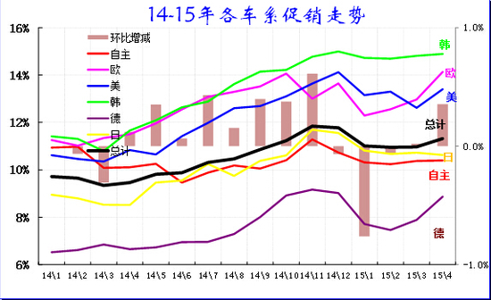 在崔东树看来,2015年的各车系价格促销走势稍有差异,自主品牌促销平稳,美系促销提升,欧系、德系的促销增幅较猛。虽然厂商采取价格促销和 贷款免息等降低消费门槛的做法,免税等促销新概念创意很好,但效果尚不理想。今年4月价格促销出现大幅上升,相对2014年4月的促销力度更大。今年3月 的降价带来4月竞品促销明显增大。