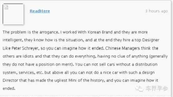 网友“ReadHere”对此评论道:“原因是他们太傲慢自负了。我曾和韩国车企合作过,他们很聪明,能看得清形势,聘请了Peter Schreyer等顶级设计师,所以我们能看到韩系车的表现。而中国的高管觉得别人都是傻瓜,他们自己是万能的,什么都会,其实什么都不会。其实没有经销商网络、售后服务等就没办法卖车,但最重要的是你聘用了曾设计时尚最丑MINI的设计师作为设计总监,结果怎样可想而知。”