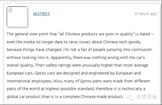 而网友“dcl7851”则表示说:“那些认为所有中国产品质量都差的观点已经过时了,甚至媒体也不敢再质疑中国高科技产品的质量,因为时代已经变了。我不是一个先入为主的人。很明显,观致的质量是没有任何问题的,它们的碰撞测试成绩甚至比大多数普通欧洲车型都高。观致是由欧洲和国际知名的设计师打造的,而且观致的大多数零件都是在世界各地制造,享有最高标准,因此实际上观致汽车是全球化的产品,而不是完全由中国创造或中国制造的。”
