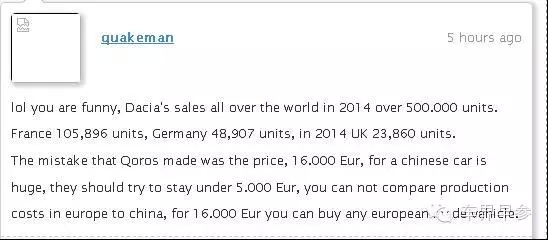 网友“quakeman”说:“达契亚2014年全球销量是50万辆,法国105896辆,德国48907辆,英国23860辆。观致的错位在于价格--1.6万欧元,对于一辆中国汽车来说太高了,应该钉在5000欧元以下。你不能拿欧洲的制造成本跟中国相比,1.6万欧元的价格几乎可以随便买欧洲制造的汽车了。”