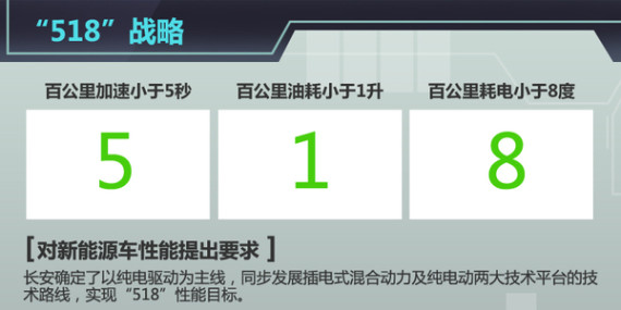 新能源蓝图现已规划完成,长安对未来新能源车型的技术指标也提出更严苛的要求。确定了以纯电驱动为主线,同步发展插电式混合动力及纯电动两大技术平台的技术路线,实现“518”性能目标。其中“5”代表新能源汽车百公里加速时间小于等于5秒,“1”表示插电式混合动力车型百公里油耗小于等于1升,“8”代表纯电动百公里电耗小于等于8度电每吨。