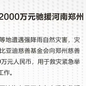 比亚迪慈善基金会向郑州慈善总会捐款2000万元人民币,用于救灾紧急举措和灾后重建工作。