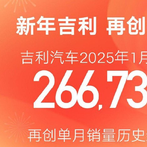 吉利汽车2025年1月销量突破26.6万辆,再创单月销量历史新高。其中,吉利品牌销量:224718 辆;领克品牌销量:30077 辆;极氪品牌销量:11942 辆。新能源销量突破12.1万辆,同比增长84%。