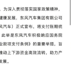 6月10日,为深入贯彻落实国家政策精神助力中小企业健康发展,东风汽车集团有限公司(以下简称东风汽车)正式宣布,将支付账期统一至60天内。此举是东风汽车积极响应国务院《保障中小企业款项支付条例》的重要举措,旨在以切实行动推动上下游资金高效流转,助力产业链良好协同发展。