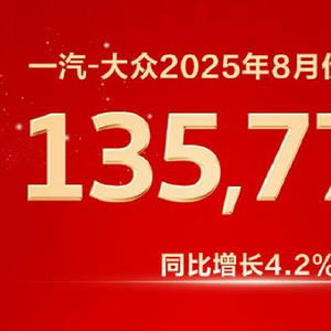9月1日,一汽-大众发布最新销量业绩,8月实现整车销售135,772辆(含进口车),同比增长4.2%。其中,大众品牌销售79,003辆,同比增长1.9%;奥迪品牌凭借新品上市势能斩获45,768辆(含进口车)销量,国产豪华燃油车市场份额排名第一;捷达品牌销售11,001辆,在品牌战略升级节点保持稳健增长态势。