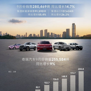 近日,奇瑞集团发布9月份及前三季度销量快报。数据显示,9月份,集团销售汽车280,469辆,同比增长14.7%;销售新能源汽车91,590辆,同比增长55.4%;出口汽车137,624辆,同比增长26.2%,连续五个月出口突破10万辆,继续保持中国汽车出口第一。其中,奇瑞汽车股份有限公司9月份销售汽车255,584辆,同比增长9%。