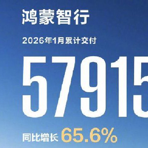 据鸿蒙智行官方消息,鸿蒙智行2026年1月累计交付57915台,同比增长65.6%。