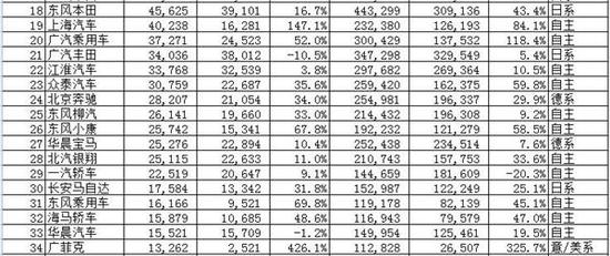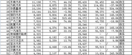除了三强外,自主品牌中同样需要给予鲜花和掌声的还有上海汽车、广汽乘用车、东风小康、东风乘用车、华晨鑫源、江铃汽车、昌河汽车、一汽吉林,增幅分别为:147.1%、52%、67.8%、69.8%、105.9%、515.4%、54.9%、91.9%。
