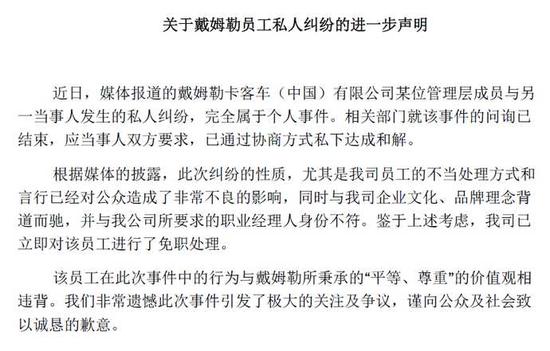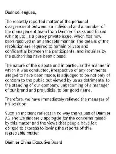21日晚,戴姆勒大中华区发布了一则声明,称由于该员工的不当处理方式已造成不良公众影响,与公司要求不符,对其进行了免职处理。同时,戴姆勒还在声明中表示对此事件发生感到遗憾,并对公众及社会致歉。在声明发布前后,该公司还在公司内部群发了一封对该高管进行免职的邮件。