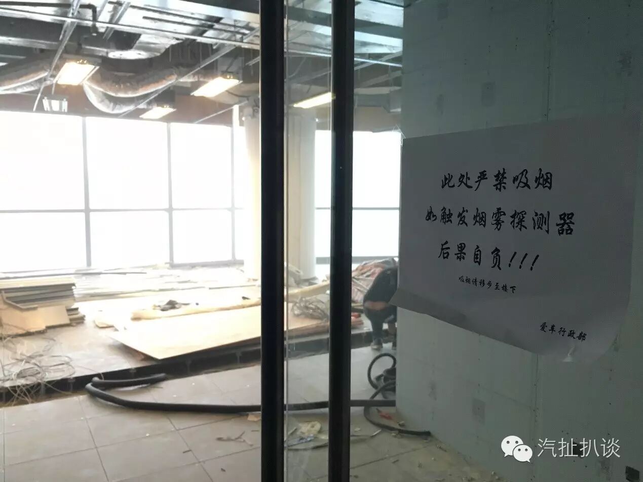 但笔者走到楼层后方,却是一个装修工地(占了整层楼的一半)。笔者通过询问在场的装修工人了解到,这一半楼层的装修项目十多天前就已经开始了,该工程属于 “上海卡说信息技术有限公司”。而装修现场张贴的一张告示中,落款是“爱车行政部”。
