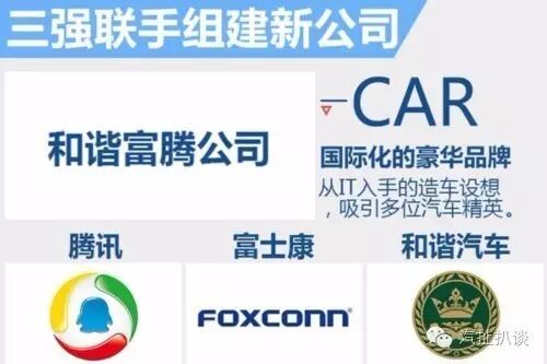2015年7月,富士康、腾讯与和谐汽车按照3∶3∶4出资,共同注册成立河南和谐富腾互联网加智能电动汽车企业新能源合伙企业(有限合伙)(简称“和谐富腾”),初始规模人民币10亿。同年12月15日,浙江爱车互联网智能电动车有限公司(简称“爱车公司”)成立,控股绿野汽车87.57%的股份,而这家公司也被看作是和谐富腾第一个投资的整车制造项目。