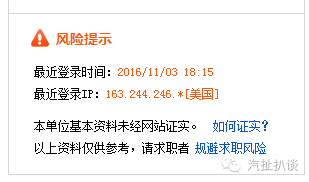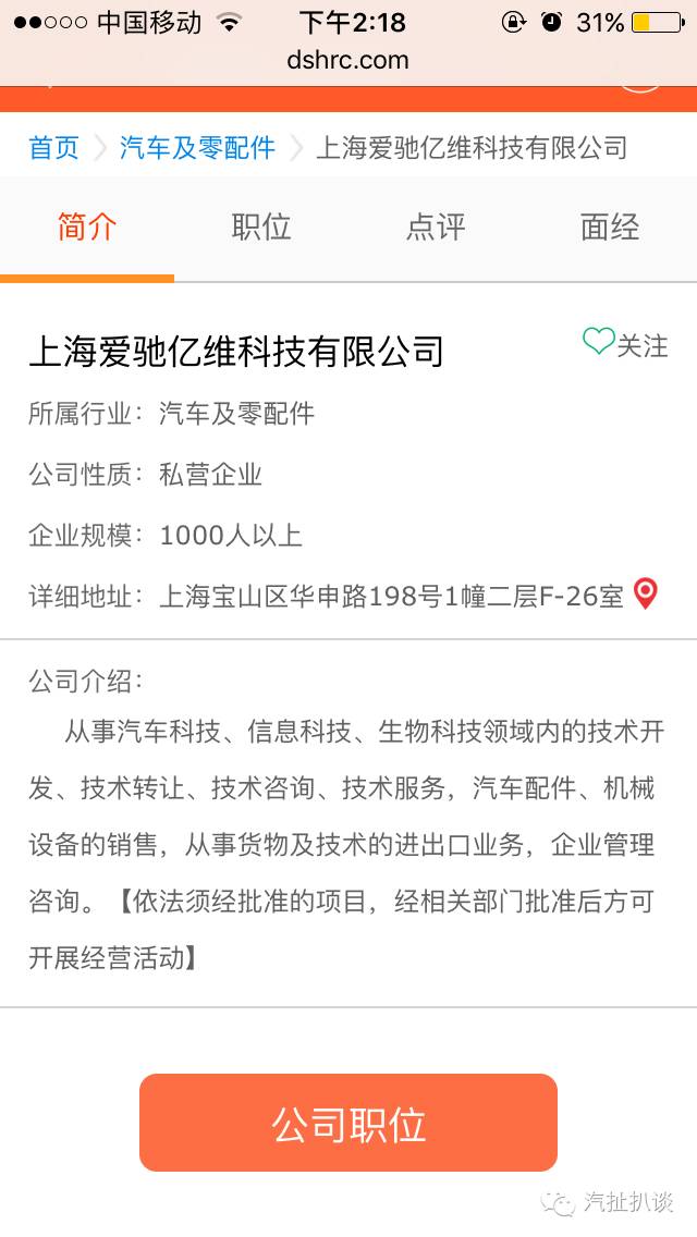 后来,笔者尝试着在网络上搜索爱驰亿维的相关信息时,发现除了与江西上饶经济技术开发区签订项目之外,网上只有一条招聘信息,显示这家“上海爱驰亿维科技有限公司”号称是一家1000人以上的私营企业,但是没有联系方式,资料也未经网站审核,带有风险提示(IP显示为美国)。