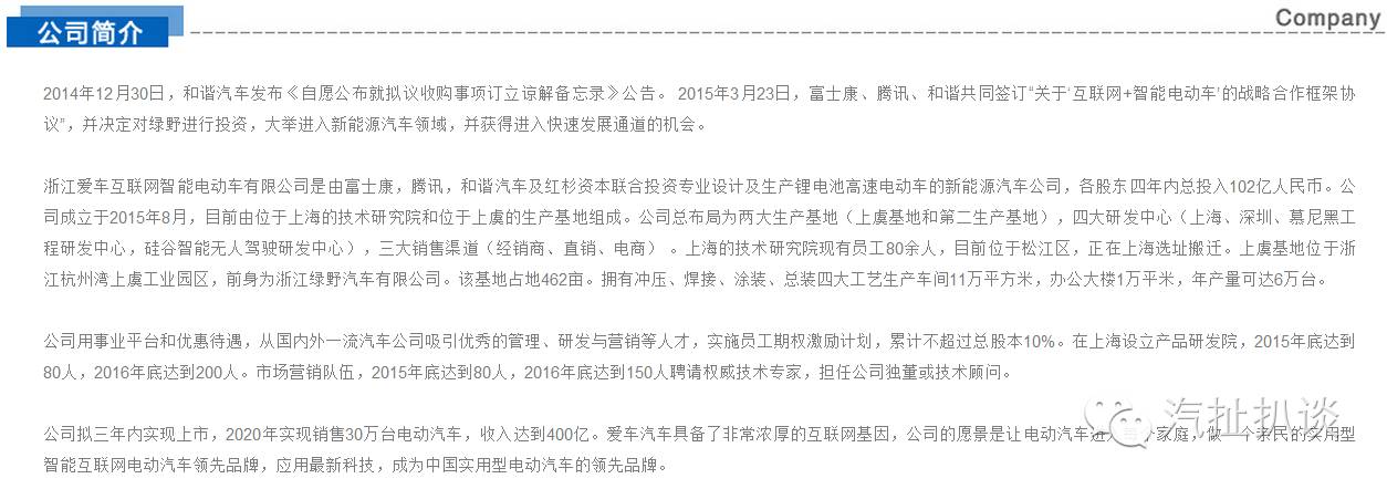 那么,爱车公司的造车项目究竟进行到了什么程度?爱驰亿维又是否是和谐富腾投资成立的?此后,“汽扯扒谈”还作了更多地走访调查和研究,发现和谐富腾的造车项目还隐藏着非常多的秘密,而真相也呼之欲出。