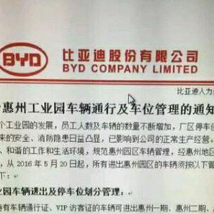 2月10日,网上流出一则疑似比亚迪公司的内部通知称,“从13号起,所有非比亚迪的车都不准开进比亚迪(生活区和厂区)。13号开车进入保安不会拦截但会记录在案,后续不准升职加薪。14号仍在开车进入会连带追究领导责任。停在园区的比亚迪车也请在此之前开出去,否则会用叉车叉走。人资刘总每天会向王总汇报此信息,以上请一定严格遵守。”