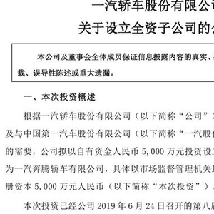 6月24日晚,一汽轿车股份有限公司(简称“一汽轿车”)发布《关于设立全资子公司的公告》。公告称,根据一汽轿车整体战略布局的规划以及与中国第一汽车股份有限公司(简称“一汽股份”)进行重大资产重组的需求,一汽轿车拟以自有资金5000万元投资设立全资子公司,公司名称暂定为一汽奔腾轿车有限公司。