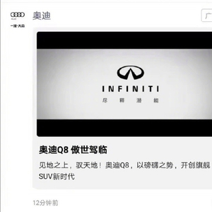 有网友评论,微信朋友圈中的这个广告奥迪和英菲尼迪都应该打钱,分别宣传了奥迪Q8和英菲尼迪QX50 (配置|询价)两款汽车。