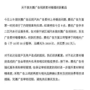 今日上午朋友圈广告出现汽车广告素材上传错误问题,腾讯广告方面第一时间进行了内部排查和处理。经查明在今日9点,腾讯广告华东二区汽车行业服务商,在对接宁波区域汽车朋友圈广告投放时,发生广告素材错播情况。收到反馈后,腾讯广告方面立即暂停下线相关广告(于10时30分暂停,总曝光为3959次,共花费202元)。
