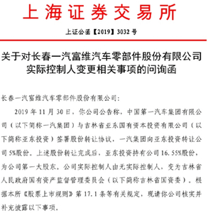 记者12月3日从长春一汽富维汽车零部件股份有限公司(下称“一汽富维”)了解到,因股权转让、实际控制人变更等相关事项,一汽富维于12月2日收到上交所问询函,要求解释一汽集团后续在一汽富维控制权有关事项上的具体安排和意图等。