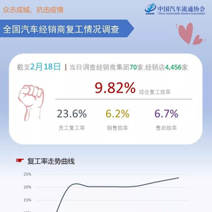 截止2月18日16时,4456家4S店中,员工复工率23.6%,销售效率6.2%,售后效率6.7%,综合复工效率仅为9.82%。