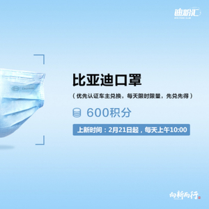 一、因口罩数量有限,认证车主可优先兑换,请在微信小程序“迪粉汇+”-首页底部“商城”-“积分兑换”-“比亚迪口罩-认证车主专享”兑换领取,每个ID限兑一次;兑换有惊喜,此处有彩蛋,限车主专享,即兑1发2共可获得20个口罩