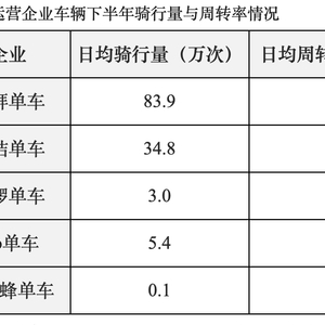 根据平台监测,2019年下半年北京全市日均骑行量为127.2万次,较上半年下降20.7%;日均周转率为1.4次/辆,较上半年增长了27.3%。在去年下半年的日均骑行量与日均周转率方面,摩拜单车、青桔单车、哈啰单车分列前三名。