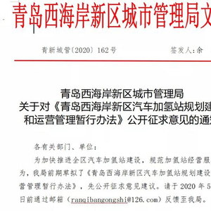 日前,青岛西海岸新区城市管理局印发的文件显示,为加快推进青岛西海岸新区汽车加氢站建设,将根据有关法律法规和技术规范,结合实际制订《青岛西海岸新区汽车加氢站规划建设和运营管理暂行办法》,现在公开征求意见。