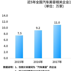 企查查数据显示,近5年全国汽车美容相关企业注册量逐年攀升,年均注册量达10.6万家,2019年达到近5年来最高的13.5万家,同比上升15.7%。