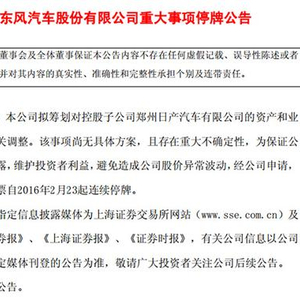 (寰球汽车 王鑫)近日获悉,东风汽车股份有限公司将对郑州日产进行资产与业务重大调整,但未对外说明调整细节,不过此次调整应该涉及面十分广,东风汽车股份有限公司对此次调整也实行了股市停牌,显示出此次郑州日产资产与业务调整的重要性。