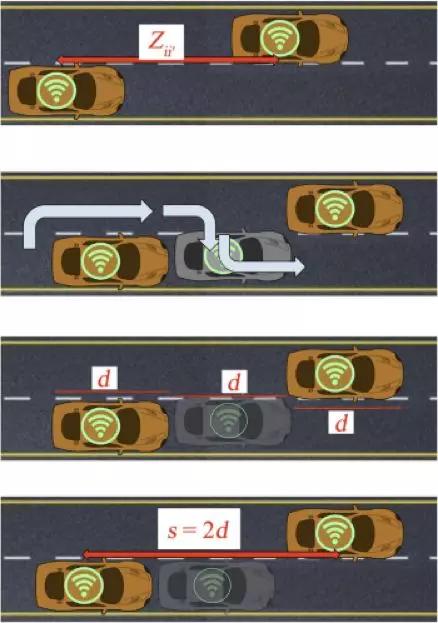 被困的自动驾驶汽车或其他联网汽车的车顶用红色标记。下图描述了被攻击车辆阻塞交通的情况,它们成为了其他汽车无法绕过的障碍物