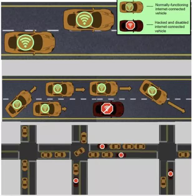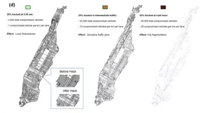 研究发现,在交通高峰期,只要20%的汽车被黑客入侵,就能有效地让交通瘫痪。