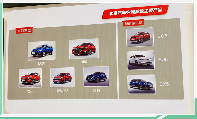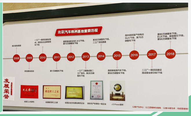 北京汽车株洲制造基地从2009年项目建设启动,随后2010年首款自主品牌乘用车下线,经过10万、30万、80万等整车下线里程。目前一、二工厂规划产能50万辆、10万台发动机及30万套动力电池,拥有4000余名员工,7个整车平台,主要生产D50、智达X3、智行等燃油车以及EC5、EU5、EX5等新能源车型。