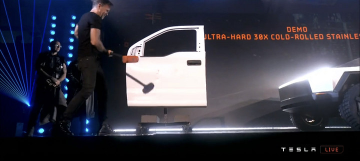 Cybertruck 有坚固的不锈钢车身,为了展示它的坚固,Musk 把发布会舞台变成了春晚小品现场。