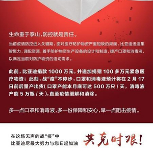 多一点口罩和消毒液,多一份保障和安心,早一点阻击疫情。在这场无声的战“疫”中,比亚迪尽最大努力与您E起加油,共克时艰!