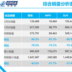 根据乘用车市场信息联席会公布的数据,2020年2月全国乘用车市场零售25.2万台,同比2019年2月下降78.5%,对比2019年2月因春节因素同比下降19%而言,已属于超低基数,说明今年疫情影响下的车市情况不容乐观。