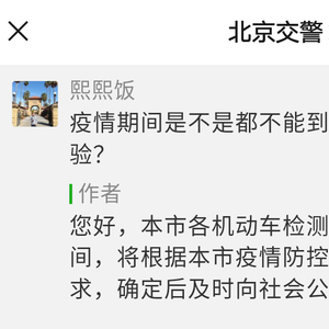 3月23日,北京交警在官方微信平台回复网友时表示,检测场复工时间在确定后将及时向社会公告。北京交警官方微信截图