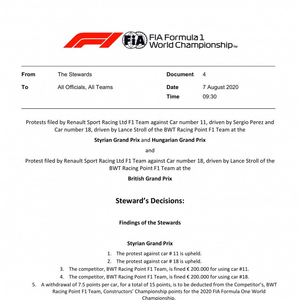F1随即做出裁决,赛点车队在F1施蒂利亚大奖赛积分取消(每车扣7.5分),并罚款40万欧元。此外,对赛点车队在匈牙利大奖赛、英国大奖赛继续使用该赛车提出训诫。