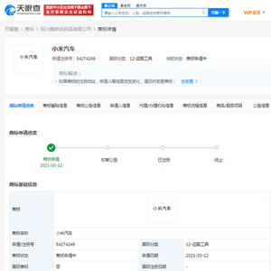 新浪科技讯 3月26日午间消息,天眼查App显示,“小米汽车”商标已被申请注册,国际分类为广告销售、运输工具,申请人为绍兴冀祥纺织品有限公司,申请日期为2021年3月,目前商标状态为“商标申请中”。