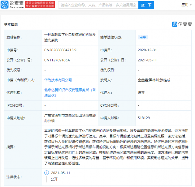 企查查APP显示,5月11日,华为技术有限公司公开“一种车辆数字化自动遮光的方法及遮光系统”专利,公开号为CN112789185A。企查查专利摘要显示,本发明涉及车辆自动遮光技术领域,用于对目标车辆的透光组件进行遮光,其中,目标车辆的透光组件上设置有调光膜。该方法在已有的汽车玻璃上进行改造,通过多维度的考量,基于不同的用户和使用环境,实现动态遮光的效果,提升了驾驶安全性和舒适性。