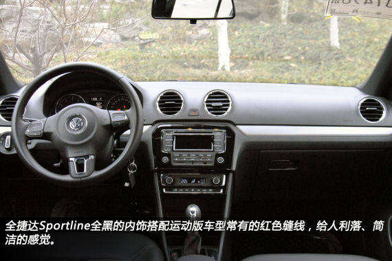 进入车内,捷达Sportline全黑的内饰搭配运动版车型常有的红色缝线,给人利落、简洁的感觉。虽然这款车的内部布局没有带给我们过多惊喜,但方向盘、脚踏板上新增的镀铬装饰,以及环绕在中央屏幕周围的钢琴烤漆还是增添了整车的质感。另外,出风口、方向盘、手刹等部件也配有碳纤维风格银色饰条。