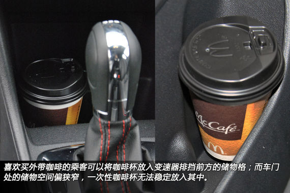 另外,在这次测试中,我们除了使用常用的饮水瓶,还增加了外卖的一次性咖啡杯做为测量工具。经过在车内不同位置置放,我们发现,由于车门处的储物槽过窄,咖啡杯只能卡在其中。