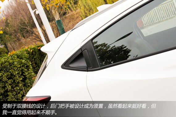 缤智的车身侧面采用了双腰线的设计,受制于车身造型,后门把手被安置在了后窗的后部,某些时候感觉使用起来并不是太方便,不过后窗隐私玻璃的设计却很惹人喜爱。