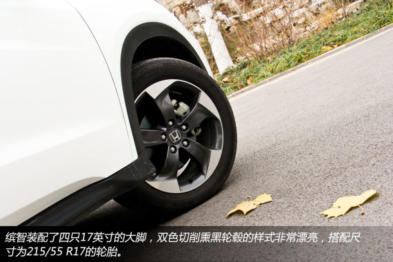 缤智装配了四只17英寸的大脚,双色切削熏黑轮毂的样式非常漂亮,搭配尺寸为215/55 R17的轮胎,不论是视觉效果还是实际使用效果都让人满意。