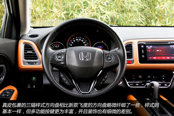 真皮包裹的三辐样式方向盘相比新款飞度的方向盘略微纤细了一些,样式则基本一样,但多功能按键更为丰富,并且装饰也有细微的差别。