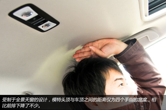 在保持驾驶座椅不动的情况下,身高172cm的模特乘坐在后排,腿部距离驾驶座椅靠背的空间超过两拳,但受制于车顶造型,头部空间相比前排有所减少。