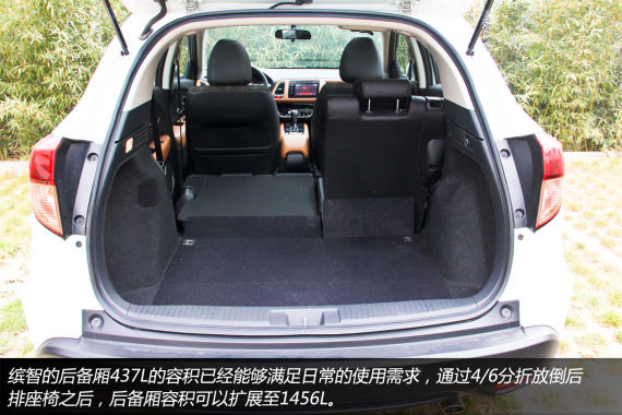 缤智车内的座椅借鉴了飞度上的设计,后排座椅拥有异常丰富的调节方式和范围,正常情况下后备厢437L的容积已经能够满足日常的使用需求,通过4/6分折放倒后排座椅之后,后备厢容积可以扩展至1456L。并且后排座椅座垫可以单独收起变成“超高模式”,实用性比较强。