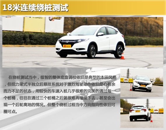在绕桩测试当中,缤智的整体底盘调校依旧是典型的本田风格,但扭力梁式半独立后悬挂系统对于激烈驾驶动作依旧是心有余而力不足的状态,用较快的车速入桩几乎很难的完美的通过每一个桩桶,往往在通过三个桩桶之后就很难再继续下去,甚至会出现一个后轮离地的情况。但整个绕桩过程当中方向指向性依旧可圈可点。
